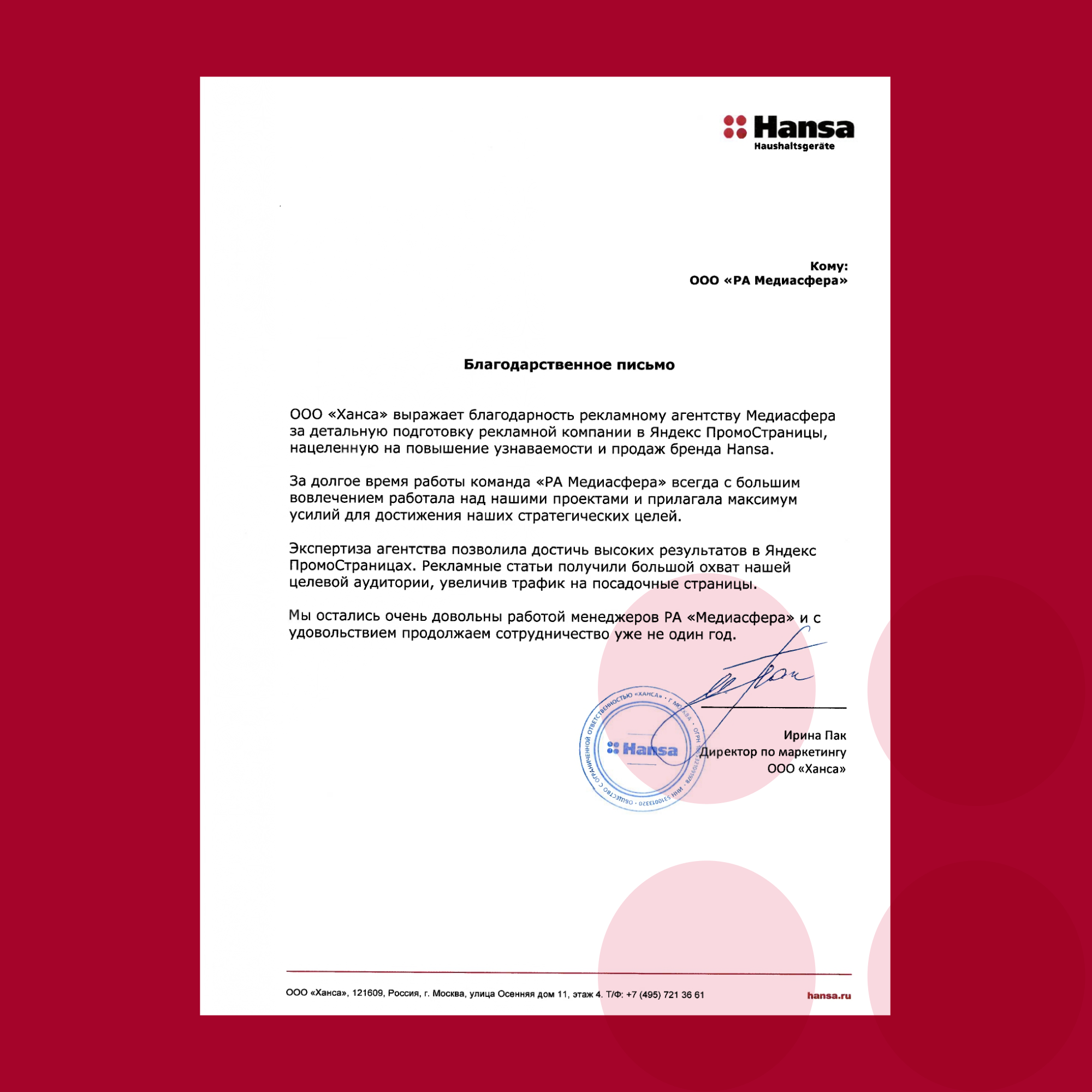 Уже 20 лет Hansa неизменно получает признание российских покупателей, практичных, открыто мыслящих и уверенных в себе людей, которые выбирают надежные решения для себя и своих близких. Бренд Hansa — это передовые технологии, поддерживающие домашний уют и семейные традиции. Период сотрудничества с января 2021 года по настоящее время.